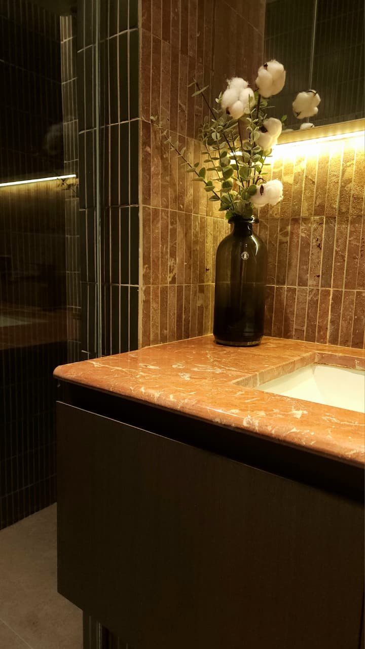 A Sanctuary of Warmth: Elevating Bathroom Design with Exotic Red Marble